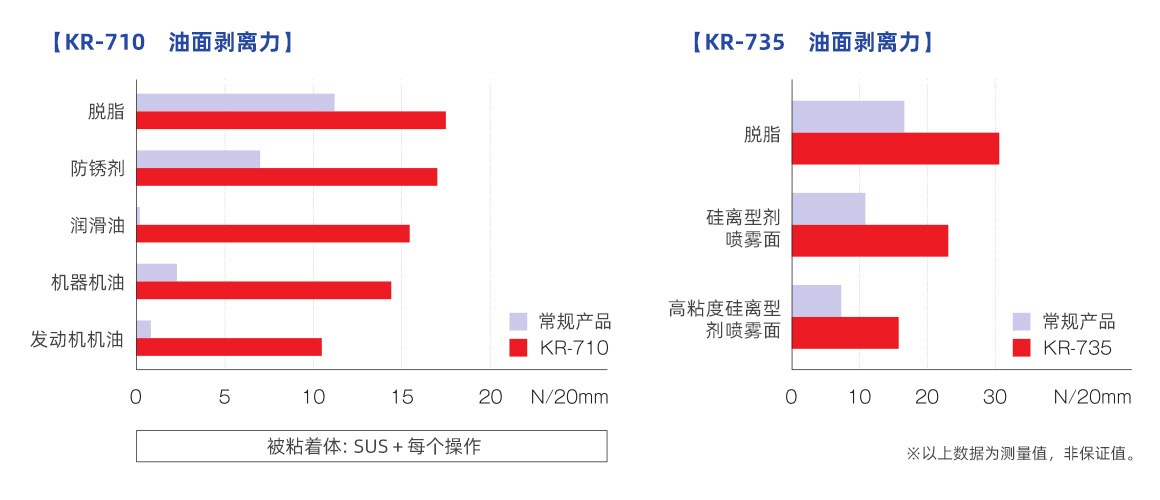 | KR-710 PW/無紡布 | 0.13 | 19.3 | 對部分潤滑油附著表面的粘性良好 |